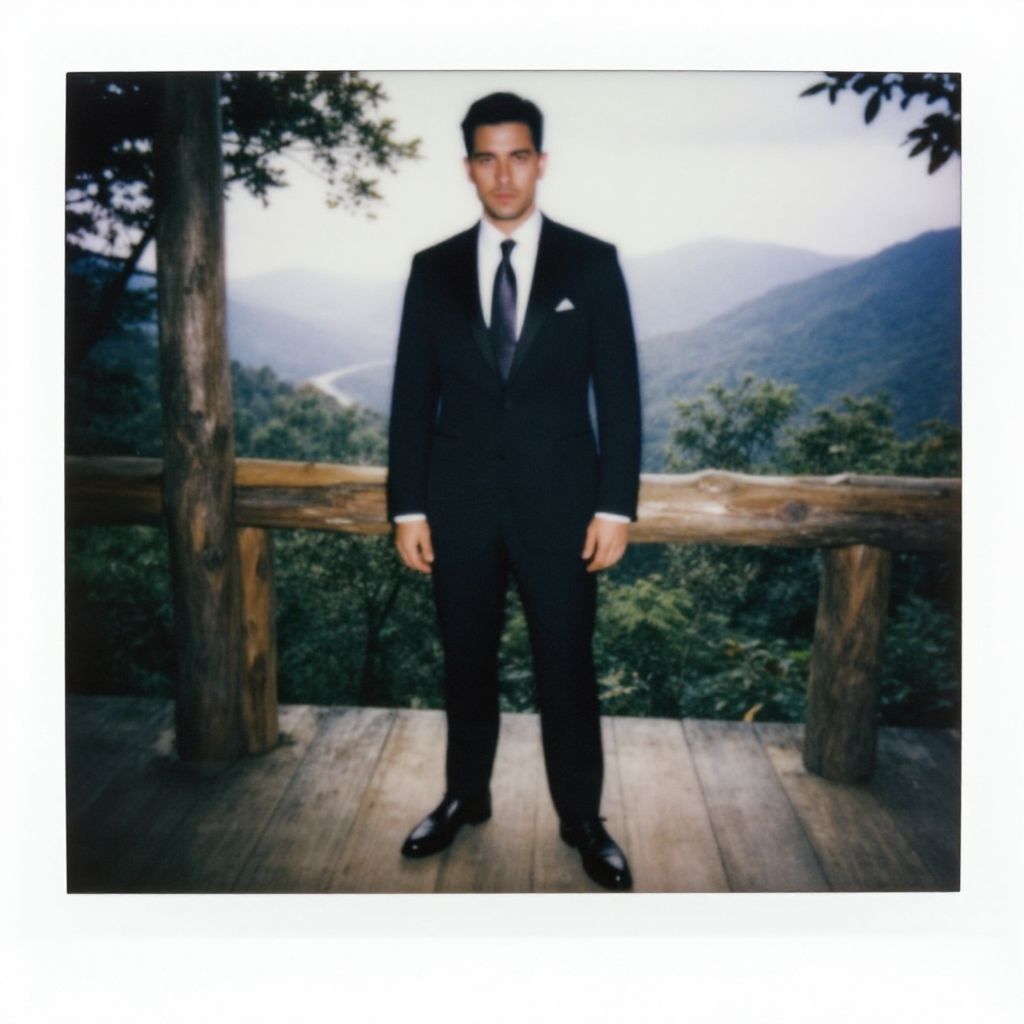 A man, casual oversized red and black flannel shirt, distressed black denim jeans, white high-top sneakers, relaxed fit, rolling green hills, rustic wooden fences, grazing horses under a bright blue sky, polaroid instant camera style, thoughtful expression. Man has masculine face and piercing eyes