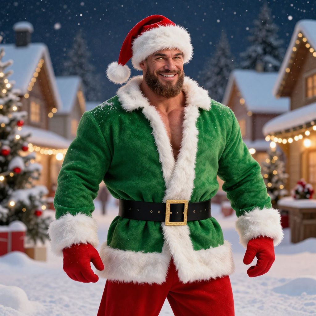 A muscular male Santa Claus in a classic festive outfit, wearing a bright green coat, red pants, and a red and white fur-lined hat with a white feather trim. He has a friendly, warm smile, glowing eyes, and a full beard, standing in a snowy winter village with twinkling lights and Christmas trees in the background. The scene is bright and festive, with a cozy atmosphere. The man is tall and athletic, with a strong build, and his posture exudes confidence and charm. His red and white hat is slightly tilted, giving a dynamic, lifelike pose. The lighting is warm and golden, enhancing the holiday mood. The image is highly detailed, realistic, and cinematic, with rich textures on the fabric and snow-covered ground.