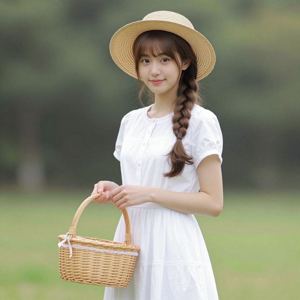 Photograph of an Asian woman standing outdoors in a grassy field with a blurred forest background. She has fair skin, long brown hair styled in a braid over her right shoulder, and wears a wide-brimmed straw hat. Her outfit is a simple, short-sleeved white dress. She holds a small, woven wicker basket in her right hand, which hangs at her side. She has a gentle smile and her eyes are slightly downcast. The overall mood is serene and pastoral, with natural lighting highlighting her delicate features and the soft textures of her dress and hat.