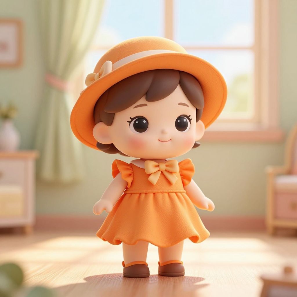 A cute, whimsical doll with a slightly rounded face, large expressive eyes, and a sweet, gentle smile, wearing a vibrant orange dress with soft ruffles at the sleeves and a delicate soft orange hat adorned with a small, elegant bow at the neckline. The doll's features exude charm and innocence, giving it a playful and heartwarming presence. The background is a serene, pastel-colored room with warm sunlight streaming through a large window, casting gentle golden rays across the floor and creating a bright, joyful atmosphere. The overall scene is inviting, dreamy, and full of nostalgic charm, blending innocence with warmth and subtle elegance.
