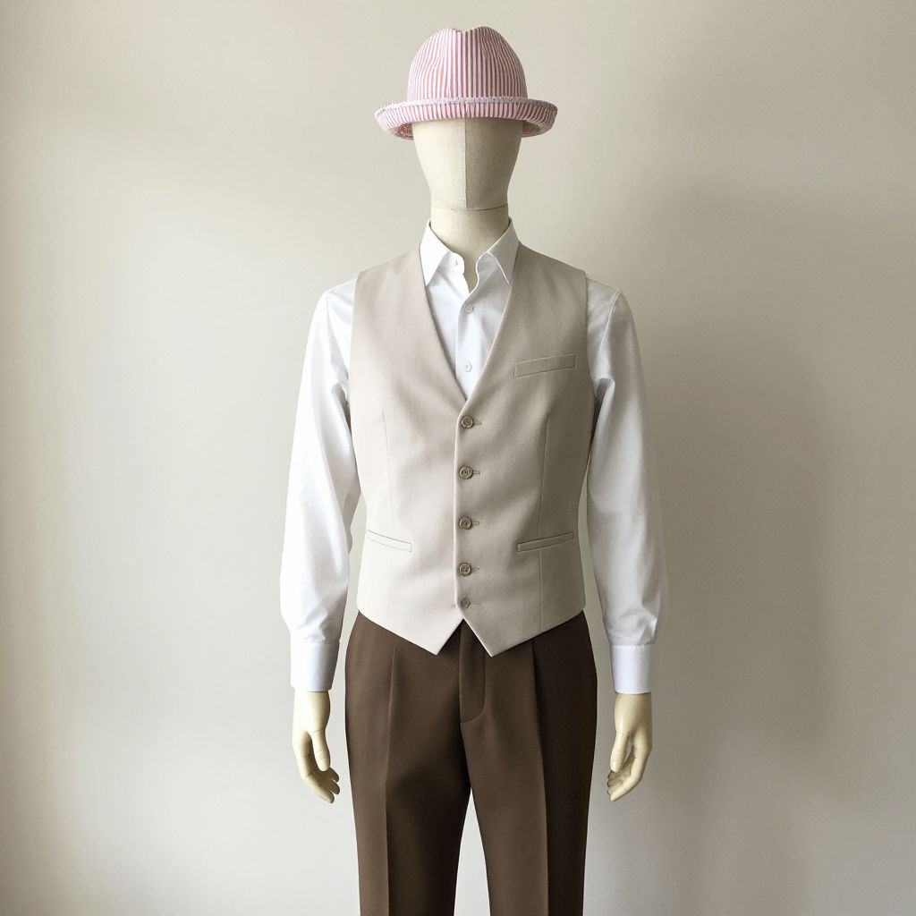 A mannequin wearing a beige vest with a white shirt and brown pants, the man has a red and white striped hat on his head. The mannequin is standing in a minimalist studio with soft natural light, emphasizing the clean lines and detailed craftsmanship of the clothing and the mannequin's pose. The scene is very still and focused, with no background distractions, highlighting the mannequin's elegant and sophisticated appearance.