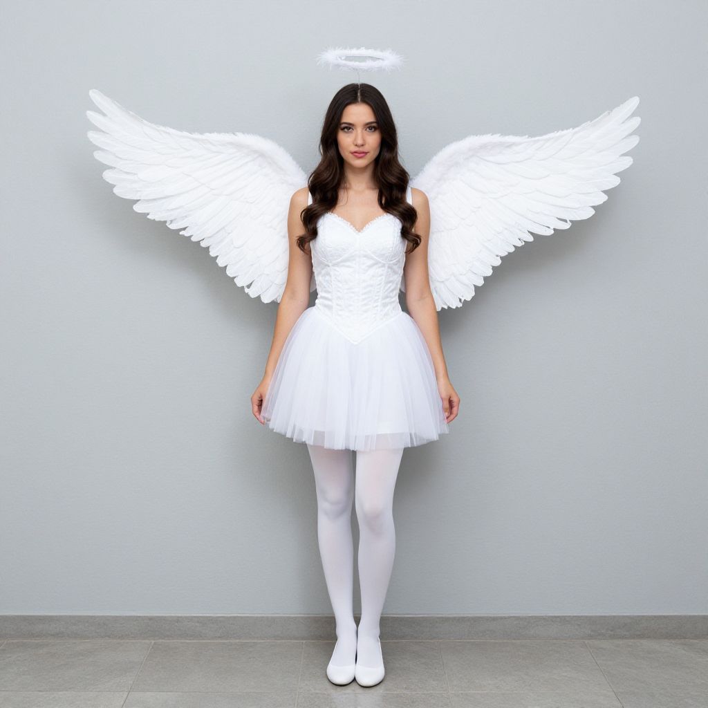 "White Angel Costume, woman in white angel costume standing in front of a wall"