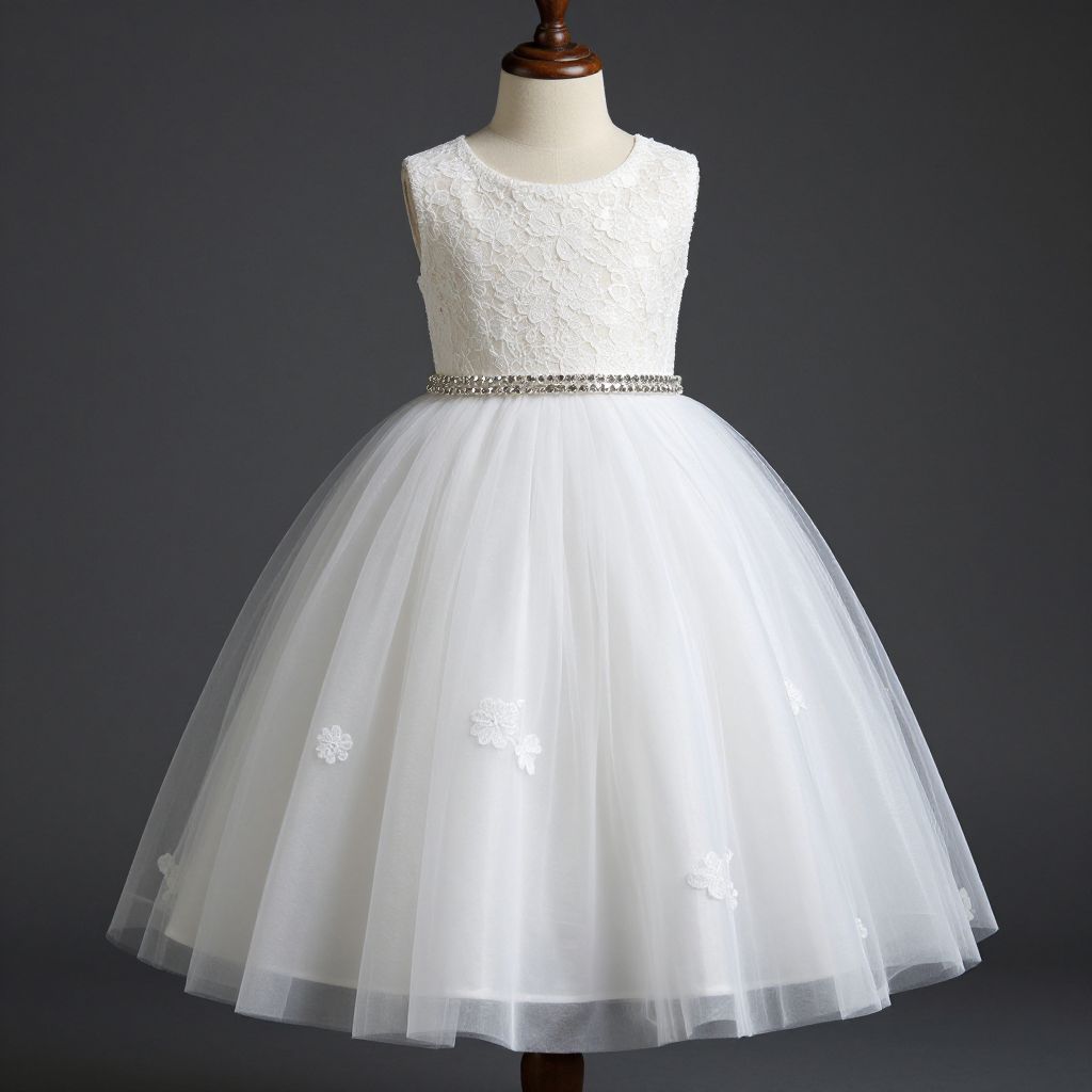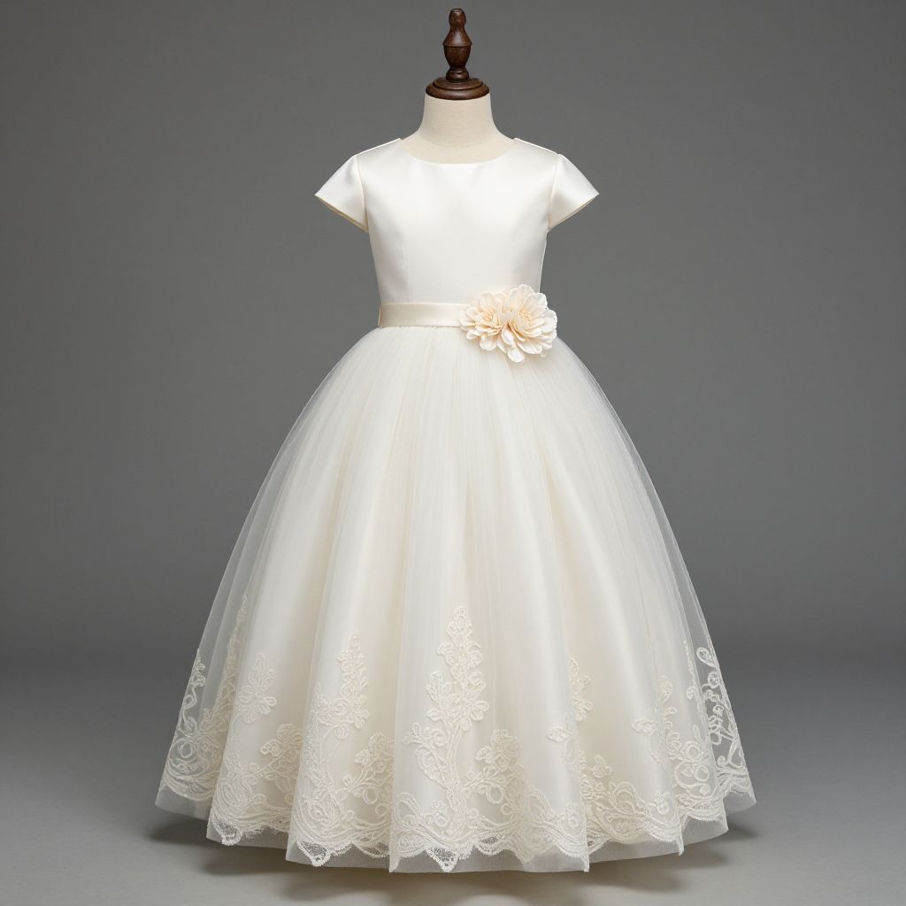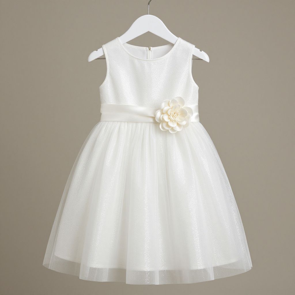 Girls White or Ivory Glitter Tulle Dress with Poly Silk Sash and Flower