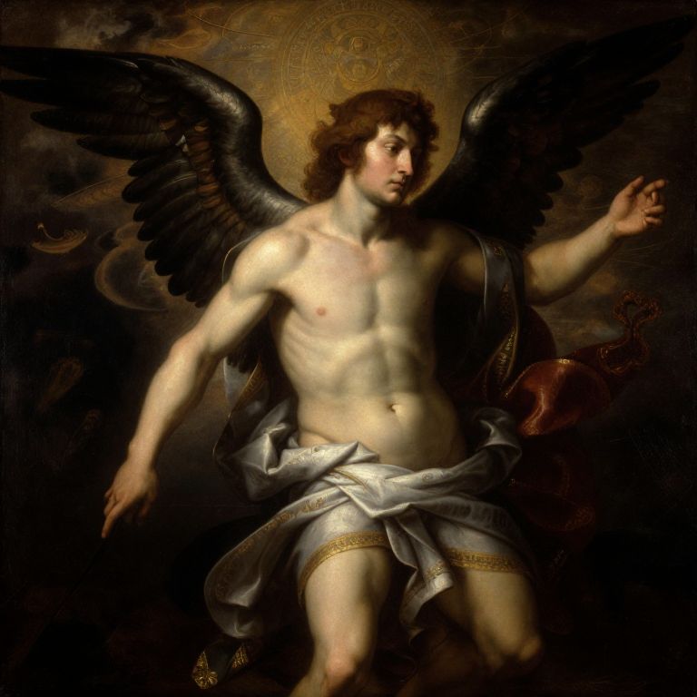 Baroque painting of a muscular, shirtless angel with dark wings, flowing white cloth around waist, gold halo, and raised right arm.
