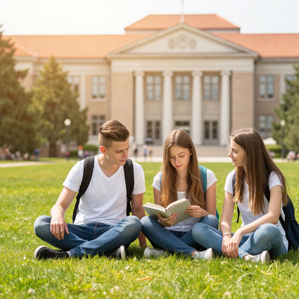 In this vibrant and lively scene, three young students are enjoying a sunny day on a picturesque campus. The central figure, a young man with a stylish haircut, sits relaxed on the grass, his hands casually resting on his knees. To his right, a young woman with long, flowing hair is engrossed in a book, her expression one of deep concentration. On the far right, another young woman, with a gentle smile, sits cross-legged, her gaze directed towards her companion. The background features a grand, classical building with a red-tiled roof and white columns, adding an air of elegance to the setting. The lush greenery and the warm, golden light of the sun create a serene and inviting atmosphere, capturing the essence of a beautiful summer day on campus.