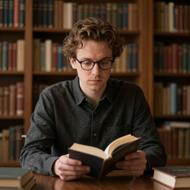 Photograph of a young white man with curly brown hair and glasses, wearing a dark gray button-up shirt, seated at a wooden table in a library. He is focused on reading an open book in front of him, holding it with both hands. The background features tall bookshelves filled with various books, slightly out of focus. The table has a polished wood surface and another closed book is partially visible on the right. The lighting is soft, creating a calm and studious atmosphere.