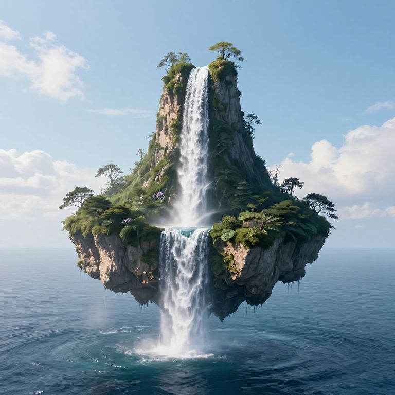 Suspended between sky and sea, a serene island cradles a gravity-defying waterfall that cascades upwards into ethereal pools, symbolizing the delicate balance between the tangible and the intangible, where serenity meets the boundless potential of dreams.