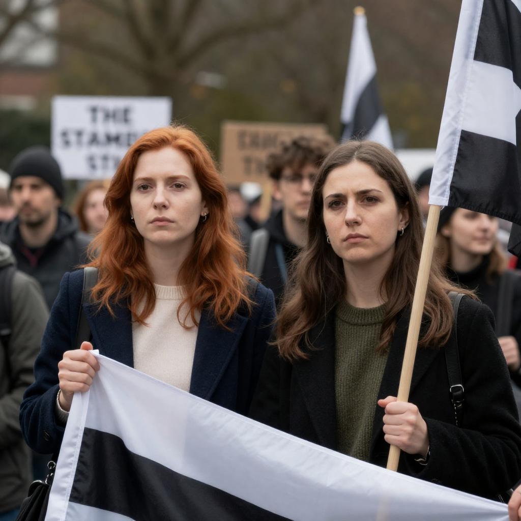 Photograph of two women in the foreground, both with serious expressions, holding black and white flags. Red-haired woman in dark coat, beige sweater; brown-haired woman in black coat, green sweater. Background includes diverse protesters, trees, and signs. Multiple people with flags visible. Natural light, daytime setting.