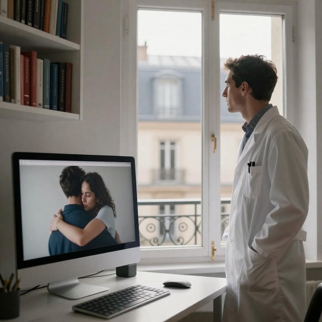 Photograph of a man in a white lab coat standing by a sunlit window, looking outside. A computer monitor on the desk in the foreground displays a close-up of two people hugging. The background includes bookshelves and a wrought iron balcony with a view of a building with gray roofs and white windows.