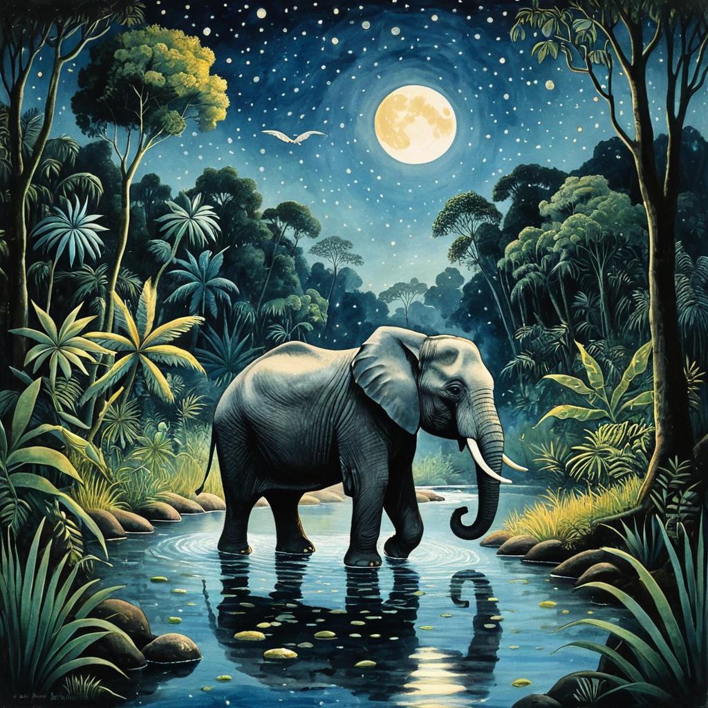 Watercolor painting in a surrealist style inspired by Henri Rousseau, depicting a serene elephant standing by a hidden jungle river under a glowing full moon and starry night sky. The mystical scene features lush tropical foliage, palm trees, silk lilies, and white doves, creating a dreamlike and magical atmosphere evocative of Sumatra's exotic landscape.