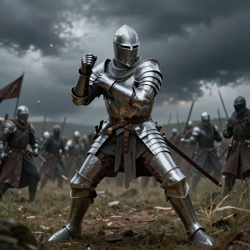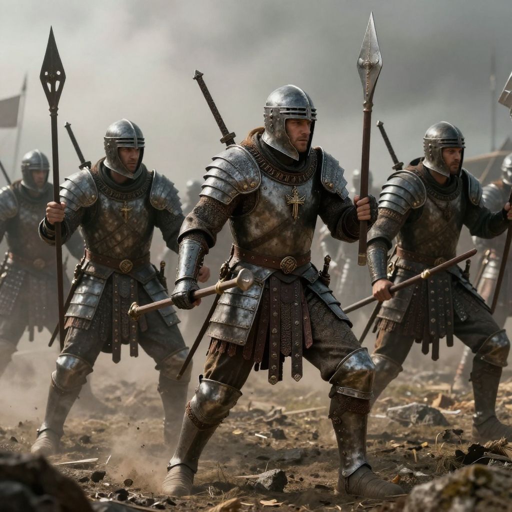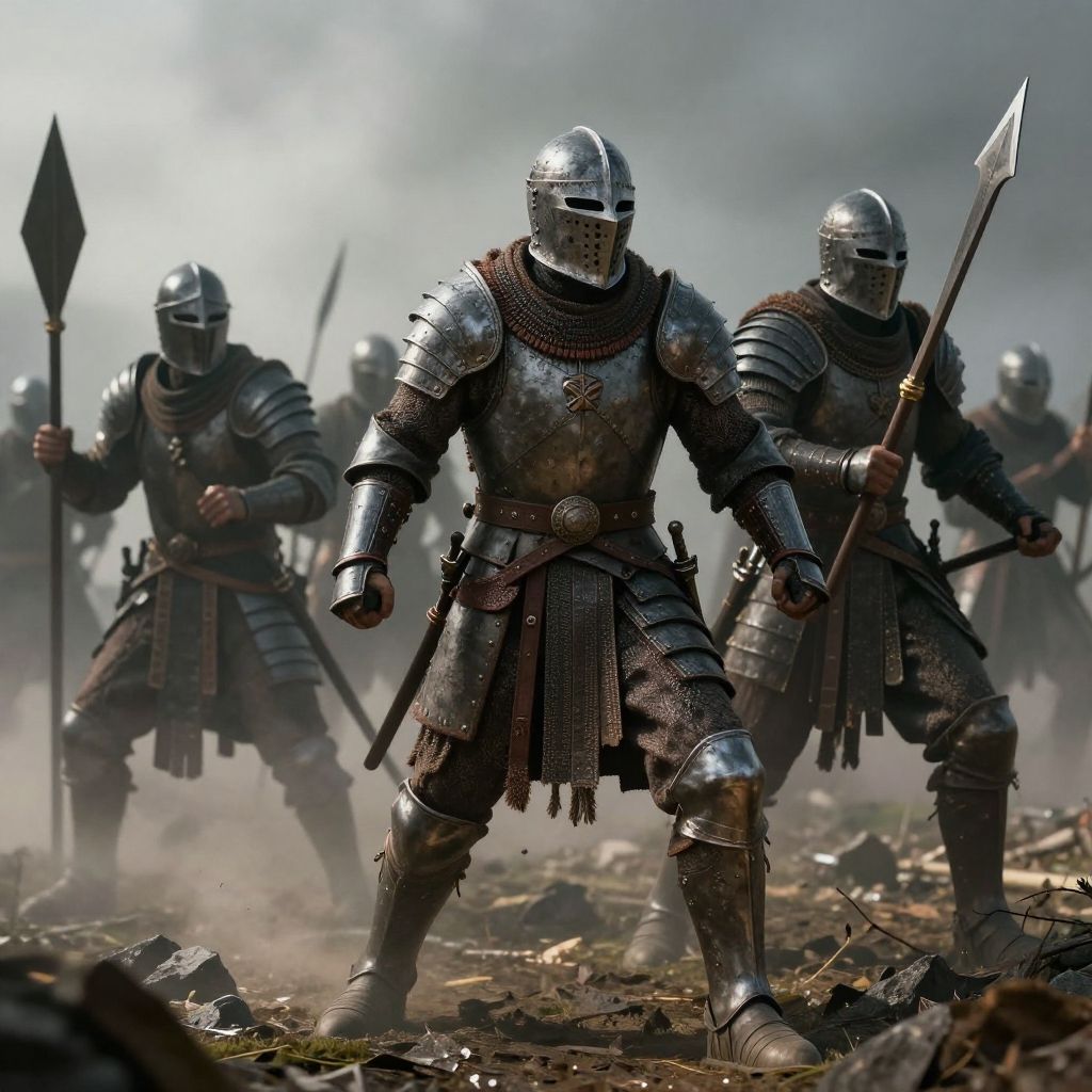 Photorealistic CGI image of four medieval knights in full armor, standing in a dusty, battle-scarred field. Each knight wears a metal helmet with a visor, chainmail, and plate armor. They hold different weapons, including spears and swords, and are positioned in a battle-ready stance. The background is blurred with smoke and faintly visible flags. The knights' armor is detailed with metal textures and chainmail patterns. The scene is lit with a harsh, bright light from the upper left, creating dramatic shadows and highlighting the metallic sheen. The overall mood is intense and action-packed.