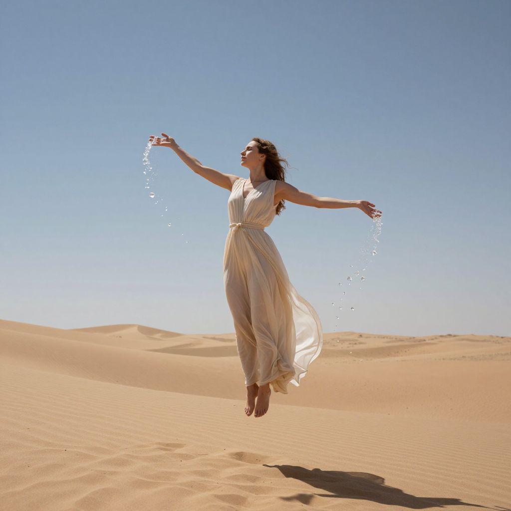 Photograph of a woman with flowing dark hair, wearing a sheer, beige, sleeveless dress, jumping in a bright, clear desert with golden sand