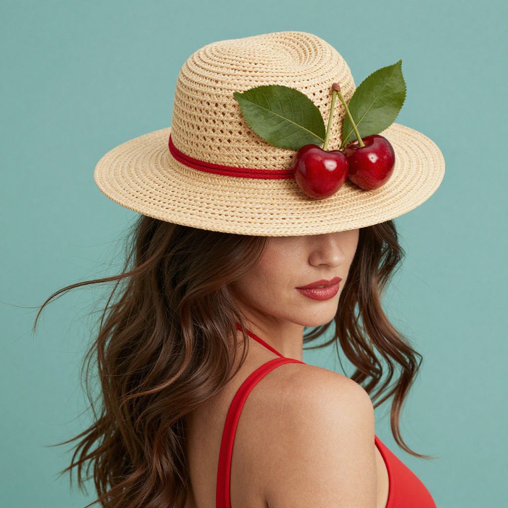 Straw hat adorned with vibrant red cherries and green leaves perched atop a woman's head, complementing her red bikini and flowing brown hair against a serene teal background.