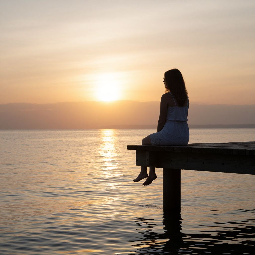 Woman sitting contemplatively on a wooden dock, gazing toward the setting sun that casts golden reflections on the calm water below.