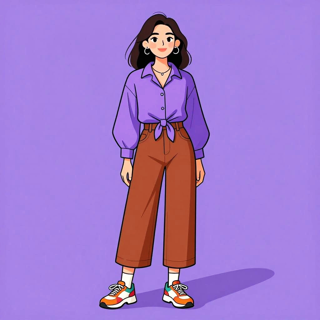 Digital illustration of a smiling woman with long black hair, wearing a purple tied blouse, brown high-waisted pants, white socks, and orange sneakers