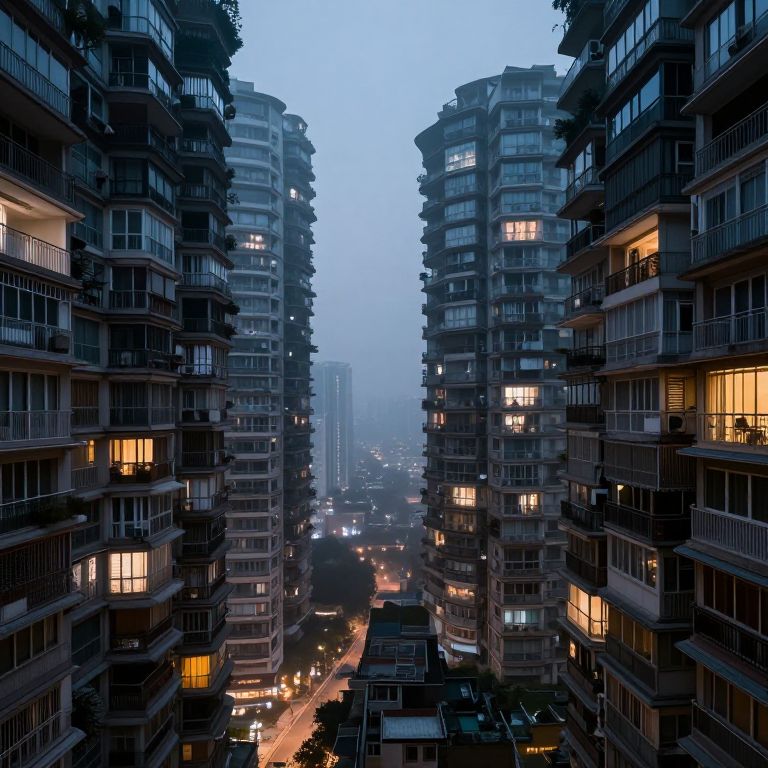 A vertiginous metropolis suspended in perpetual twilight, where layered balconies stretch endlessly into a foggy abyss, defying gravity and perspective in a dreamlike urban labyrinth.