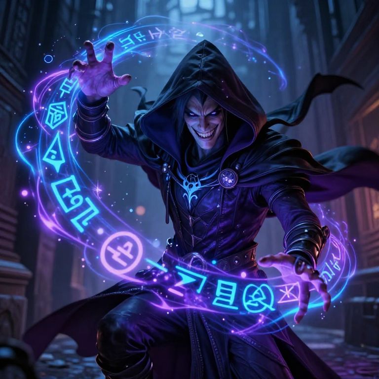 Arcane trickster art depicting a mysterious rogue weaving glowing blue and purple magical runes, with a shadowy cloak and a sly smirk, surrounded by sparkling illusions in a dark alley, fantasy style with intricate details and vibrant colors.