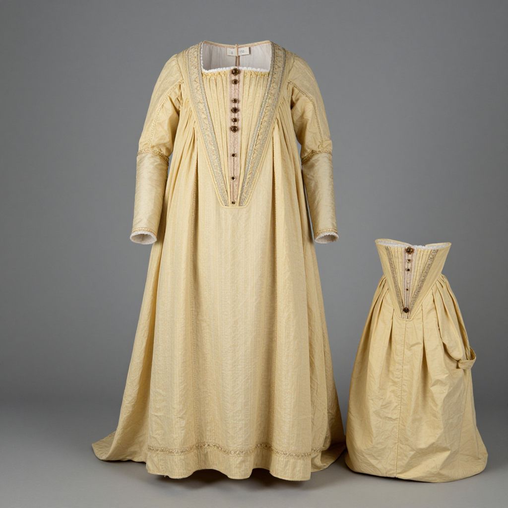 Photograph of a historical, gold-colored, long-sleeved, floor-length dress with intricate white lace trim along the neckline and sleeves. The dress features a deep V-neck with five black buttons down the front. A matching skirt is displayed to the right, showcasing a high, stiffened waist with a similar lace trim and black buttons. The background is a solid, muted gray, highlighting the garment's elegant, vintage design. The dress's fabric appears to be a smooth, satin-like material.