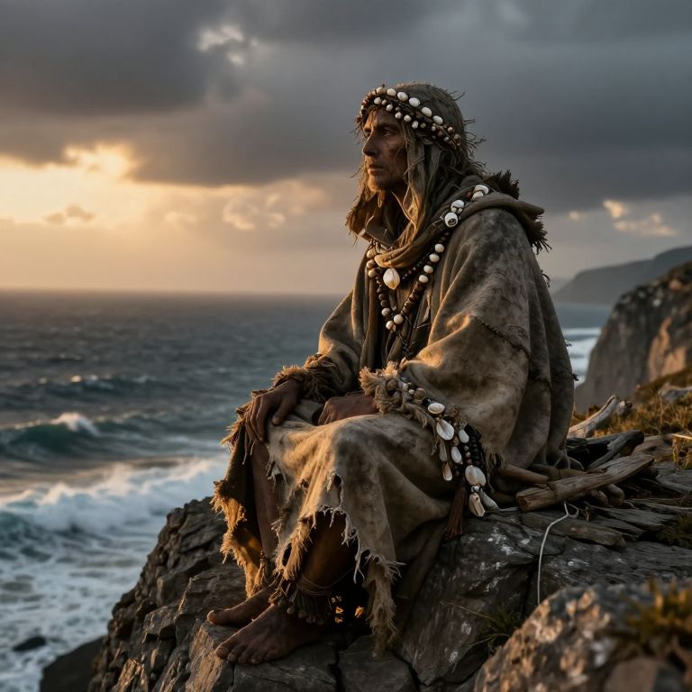 Enigmatic recluse, weathered by time, sits atop a craggy cliff at dusk. Golden light pierces darkening skies, illuminating rugged features against tumultuous ocean and storm clouds. Handcrafted attire—tattered cloak adorned with seashells, beads, driftwood—completes the scene. This portrait evokes introspection, resilience, and belonging amidst untamed wilderness.