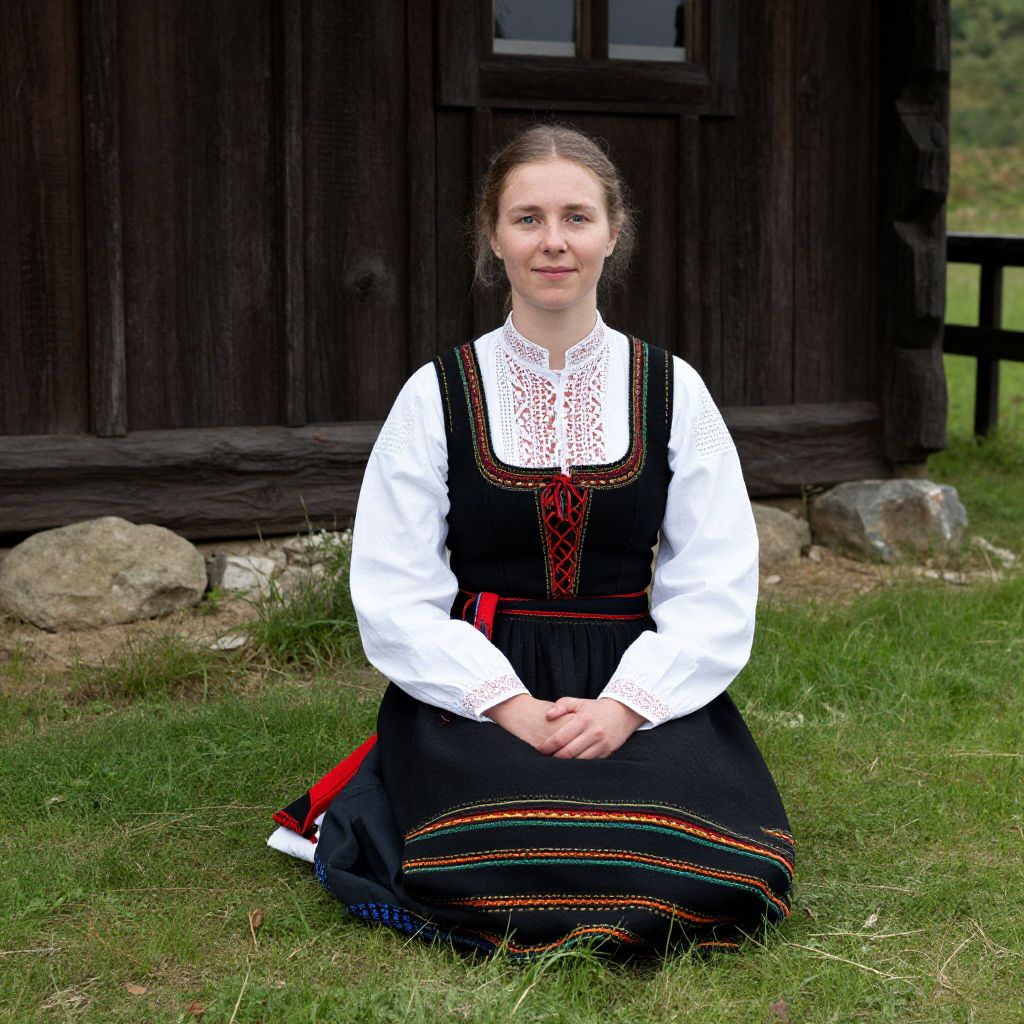Breton folk costume, woman in traditional dress sitting on grass in front of a wooden building