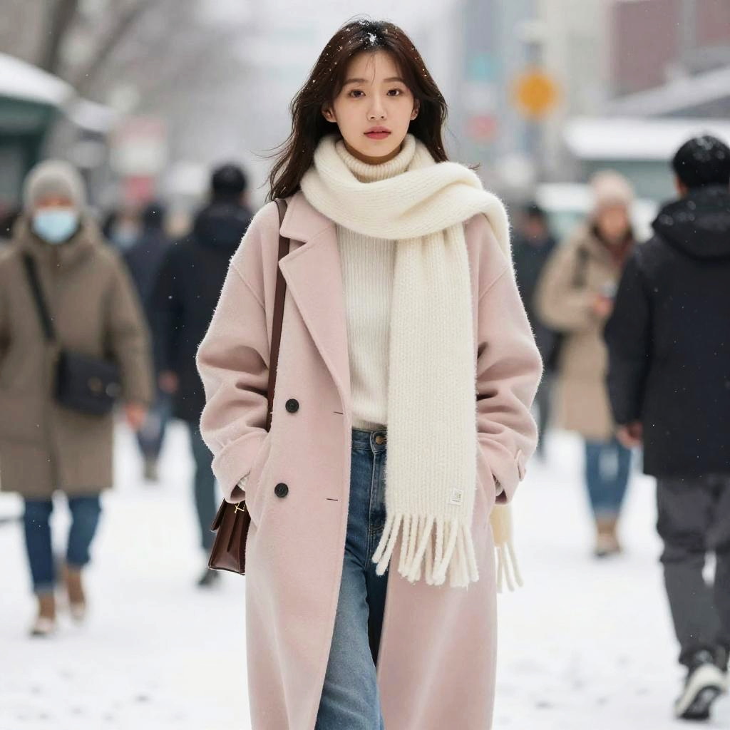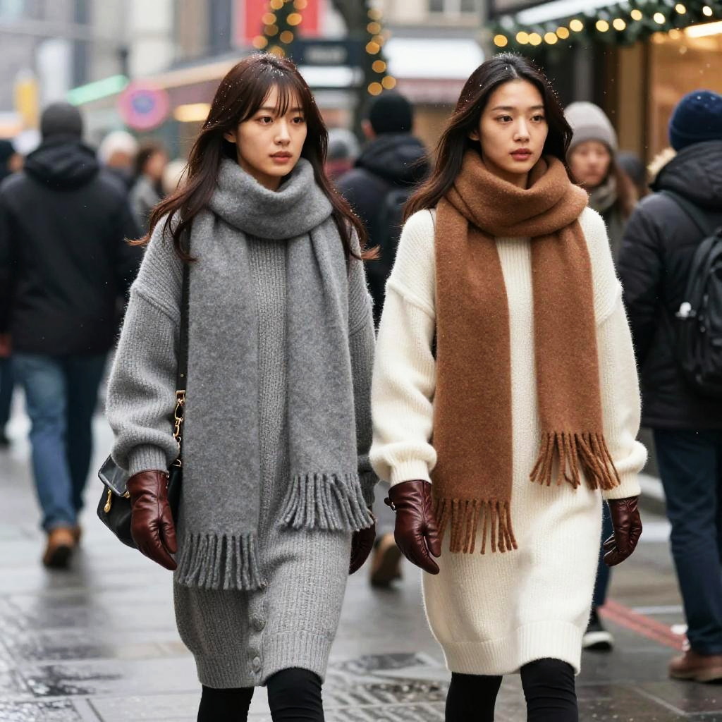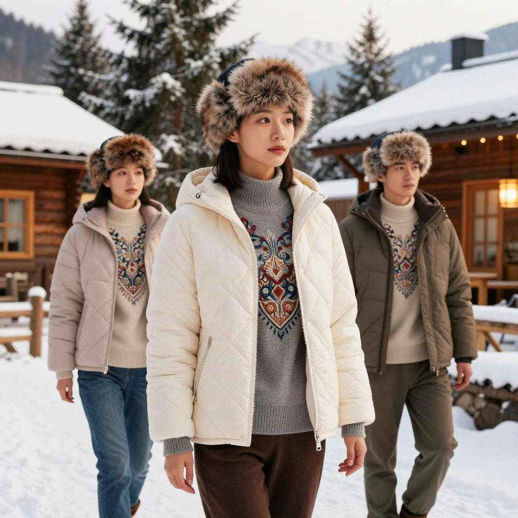 Asian winter fashion in a cozy mountain village setting, models dressed in quilted jackets, faux fur hats, and thermal wear with intricate embroidery details, surrounded by snow-covered pine trees and warm ambient light from wooden cottages.