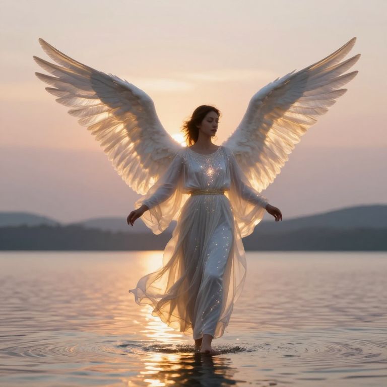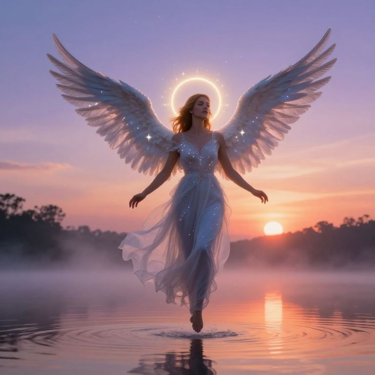Fantasy scene of twilight cleric gods rising from a misty lake at sunset, robes shimmering with stars, halos of light encircling their heads, celestial birds flying overhead under a dusky sky