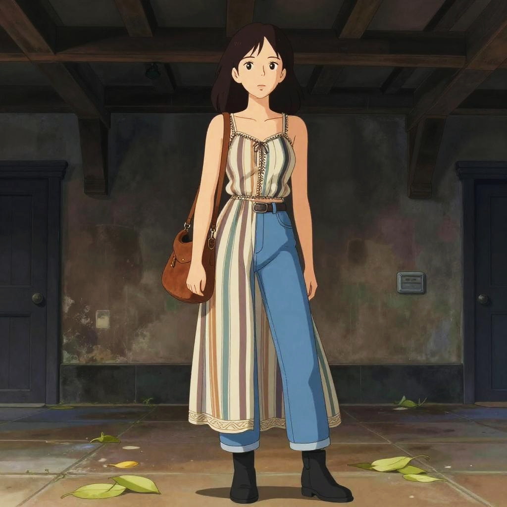 A lean woman in a boho-chic striped maxi dress with earthy tones, layered over straight-leg blue jeans, stands beneath the heritage pub's ceiling beams. She carries a brown suede shoulder bag and wears black ankle boots, her natural wavy hair cascading around her shoulders. Visual style: toei animation. Sexy. Pretty face and beutiful eyes