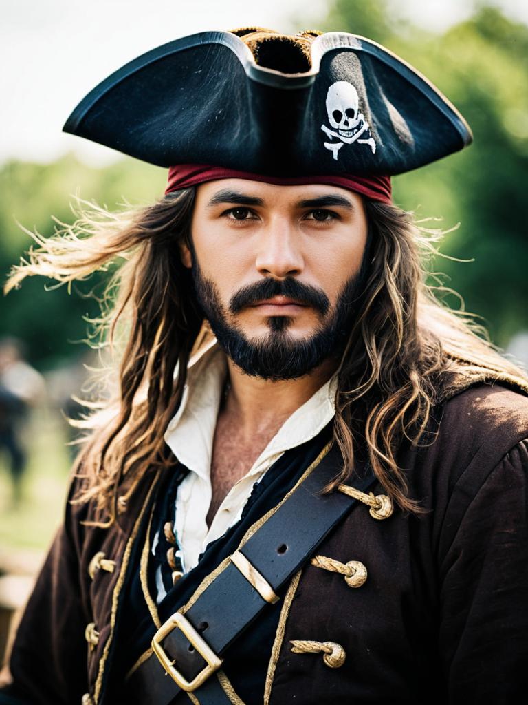 Portrait of a man dressed as a pirate with long brown hair, a beard, and mustache. He is wearing a traditional black pirate hat with a skull and crossbones emblem, a brown coat with gold trim, and a leather belt. The photo is taken outdoors with a blurred green background, focusing on his intense expression and upper body.