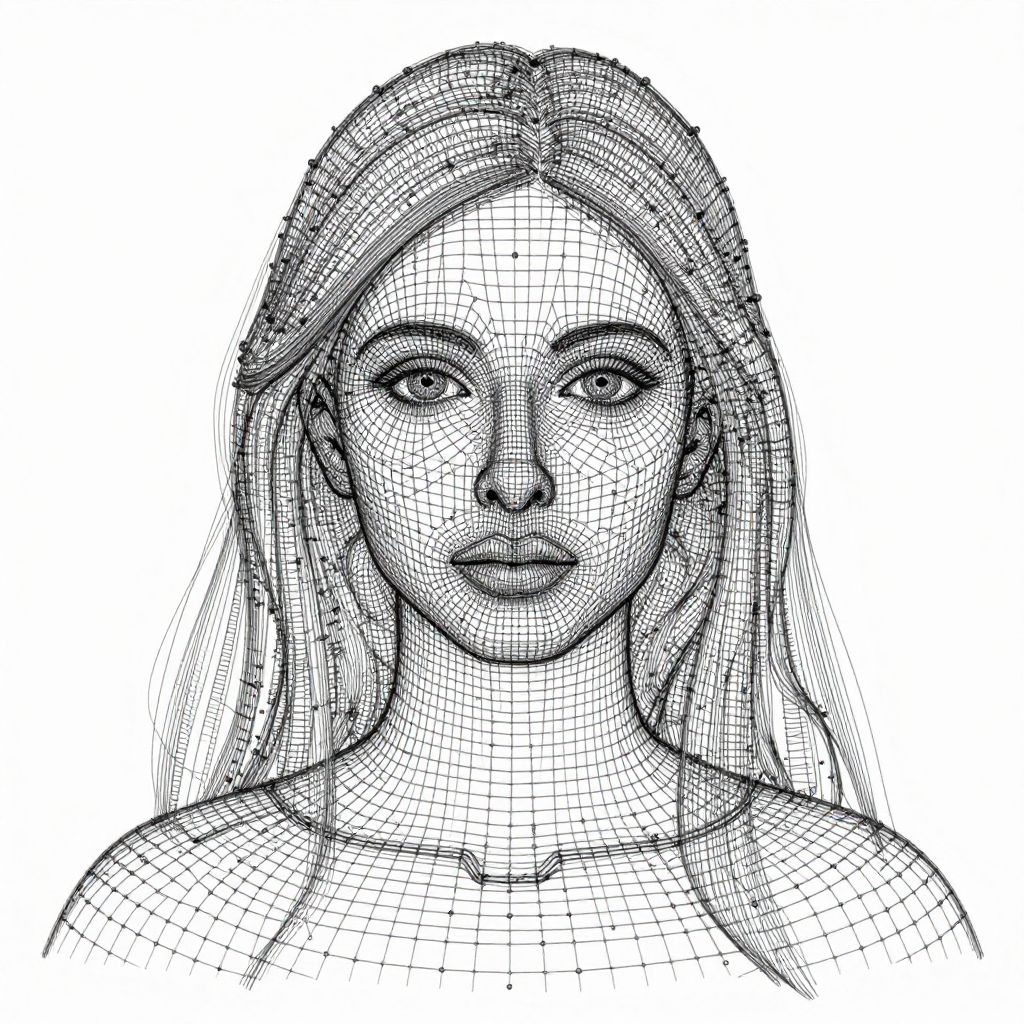 A wireframe portrait of a woman with intricate geometric lines and dots, reminiscent of Adam Martinakis' style.