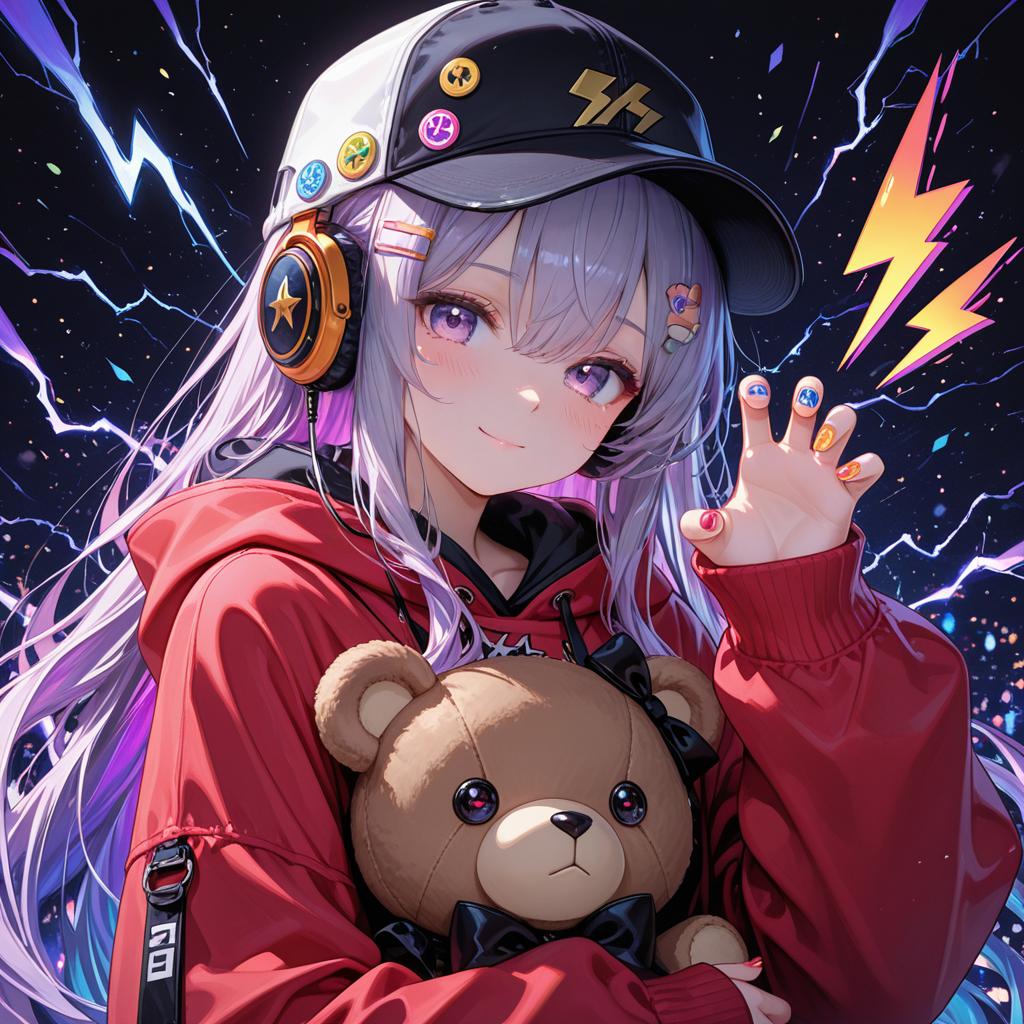 Digital artwork of an anime-style girl with long purple hair, wearing a red hooded jacket and a black and white baseball cap adorned with multiple colorful badges. She has large purple eyes with a gentle smile, blush on her cheeks, and is holding a brown teddy bear with black bows. The girl has multicolored nail polish and wears headphones with a star emblem. The background features dynamic lightning bolt graphics in vibrant colors, enhancing the energetic and playful atmosphere.