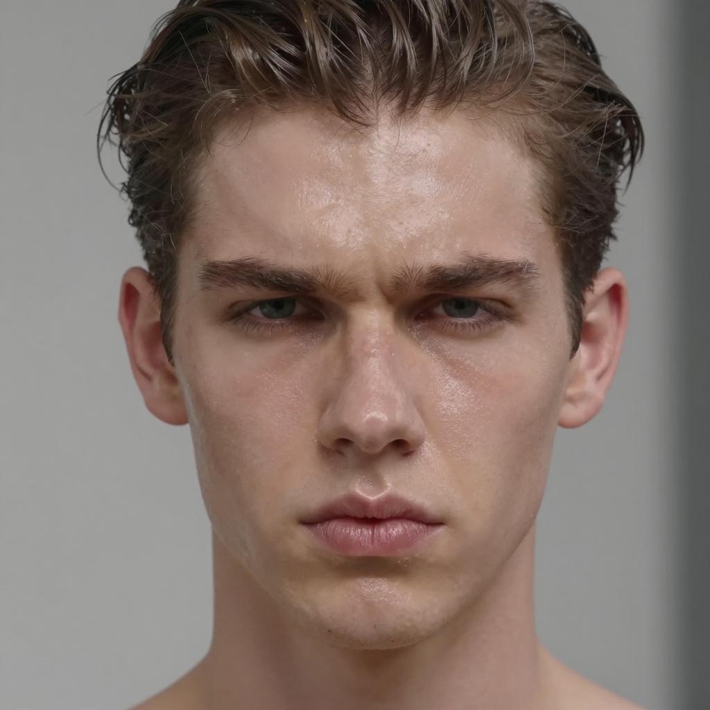 Shirtless man with wet, sweaty skin and tousled brown hair holds a blood-stained syringe to his mouth. Dark, blurred background. His intense eyes are directed at the camera. Blood on his lips and chin. His right hand grips the syringe.