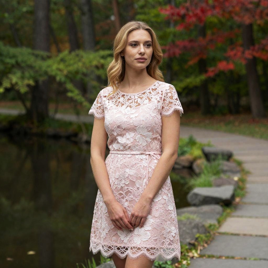 Woman with light skin and blonde hair stands in a forest, wearing a pink and white floral lace dress. She stands slightly to the right, facing forward with hands clasped. Background includes trees with green and red leaves, a reflective pond, and a stone path. Natural light.