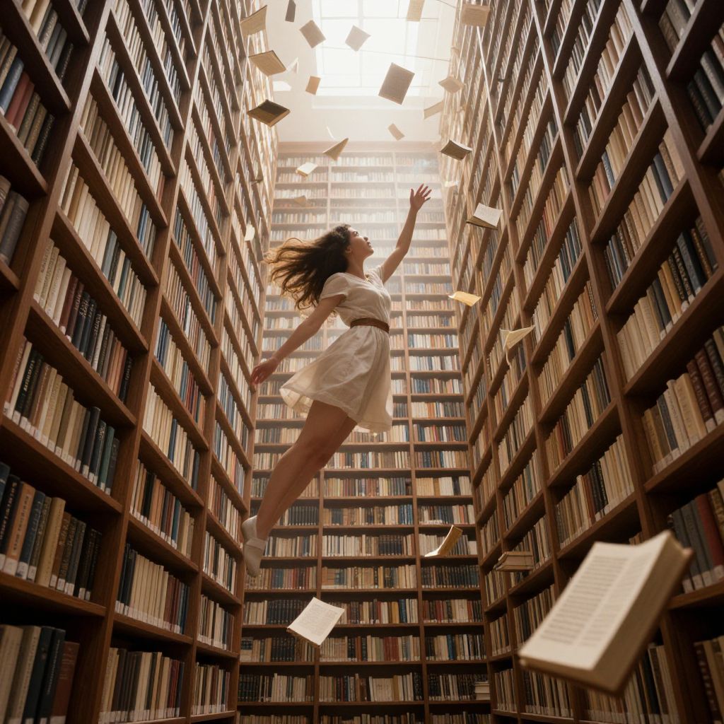 Woman soaring amidst towering bookshelves in a surreal library, surrounded by cascading pages and floating books, as she reaches out toward the ethereal light above.