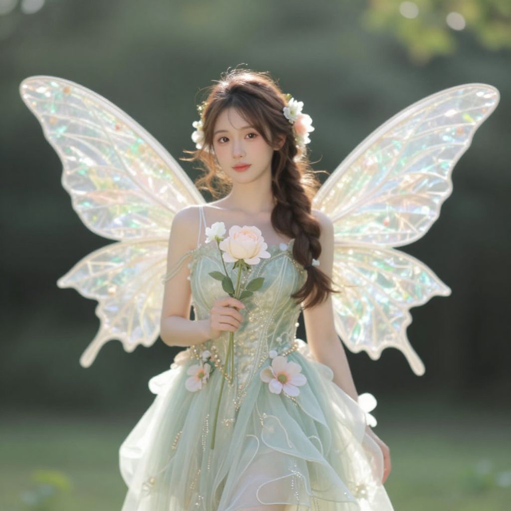 Woman flower fairy costume, wings, solo, flower, 1girl, dress, fairy, fairy wings, outdoors, nature, hair flower, blurry