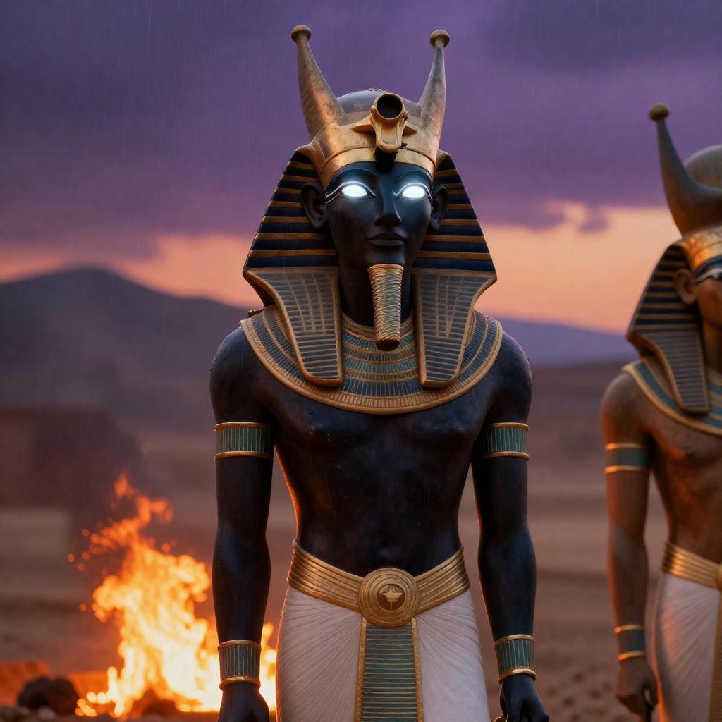 Digital illustration of ancient Egyptian scene. Two large stone statues frame a group of people. Central figure with staff, black and gold headdress, red robe. Others wear simple tunics, head wraps. Desert cityscape in background. Sunlight casts shadows. Faces neutral to slightly concerned.