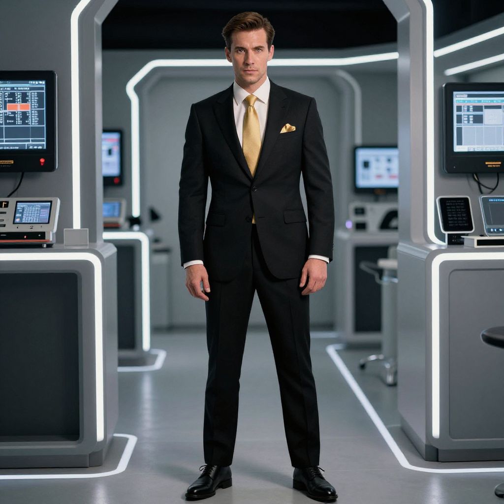 A man, slim-fit black suit, ivory dress shirt, gold tie, gold pocket square, matte black oxford shoes, sleek modern design, neon lights, high-tech machines, Ilford film stock, confident expression. Man has masculine face and piercing eyes