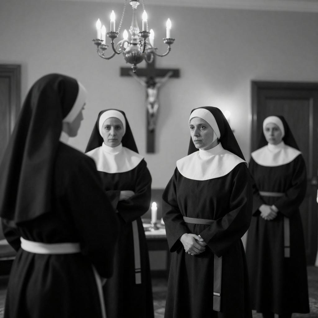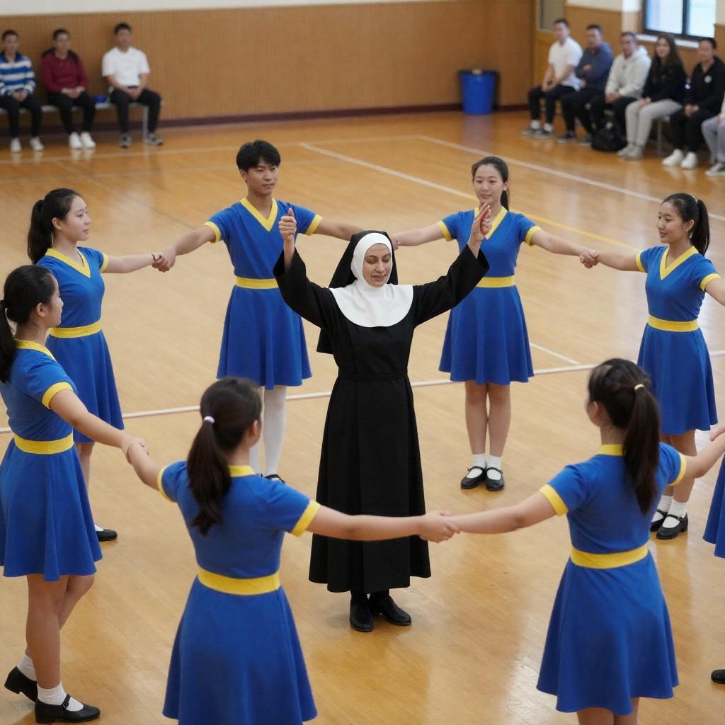 Photograph of a school gym. Nun in black habit and blue dress, surrounded by male and female students in blue and yellow uniforms, performing a dance. Students hold hands in pairs, smiling. Wooden floor, spectators in background. Nun centered, students in semi-circle around her.