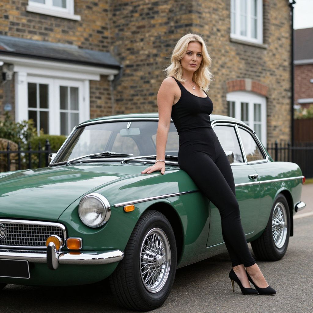 Blonde woman leaning confidently against a classic green MGB GT, showcasing its sleek design and polished chrome details in front of a residential brick building.