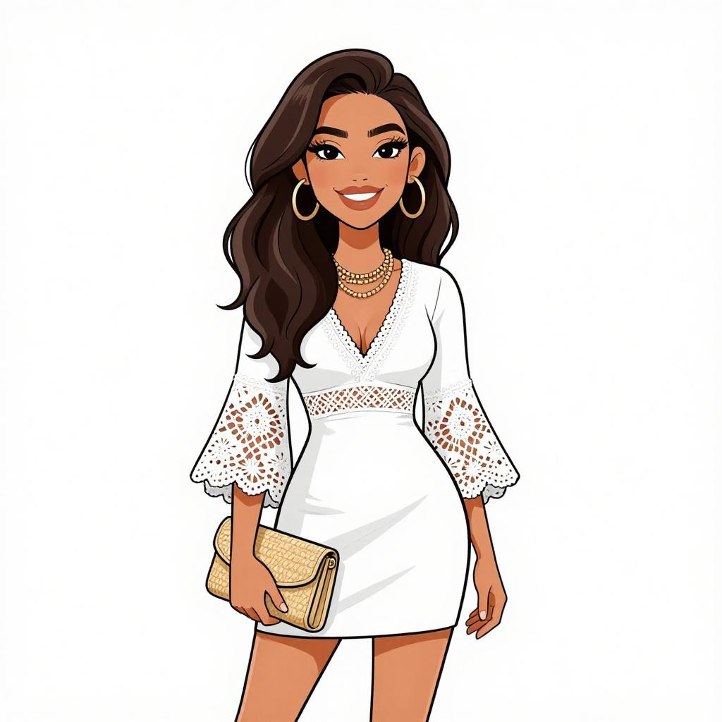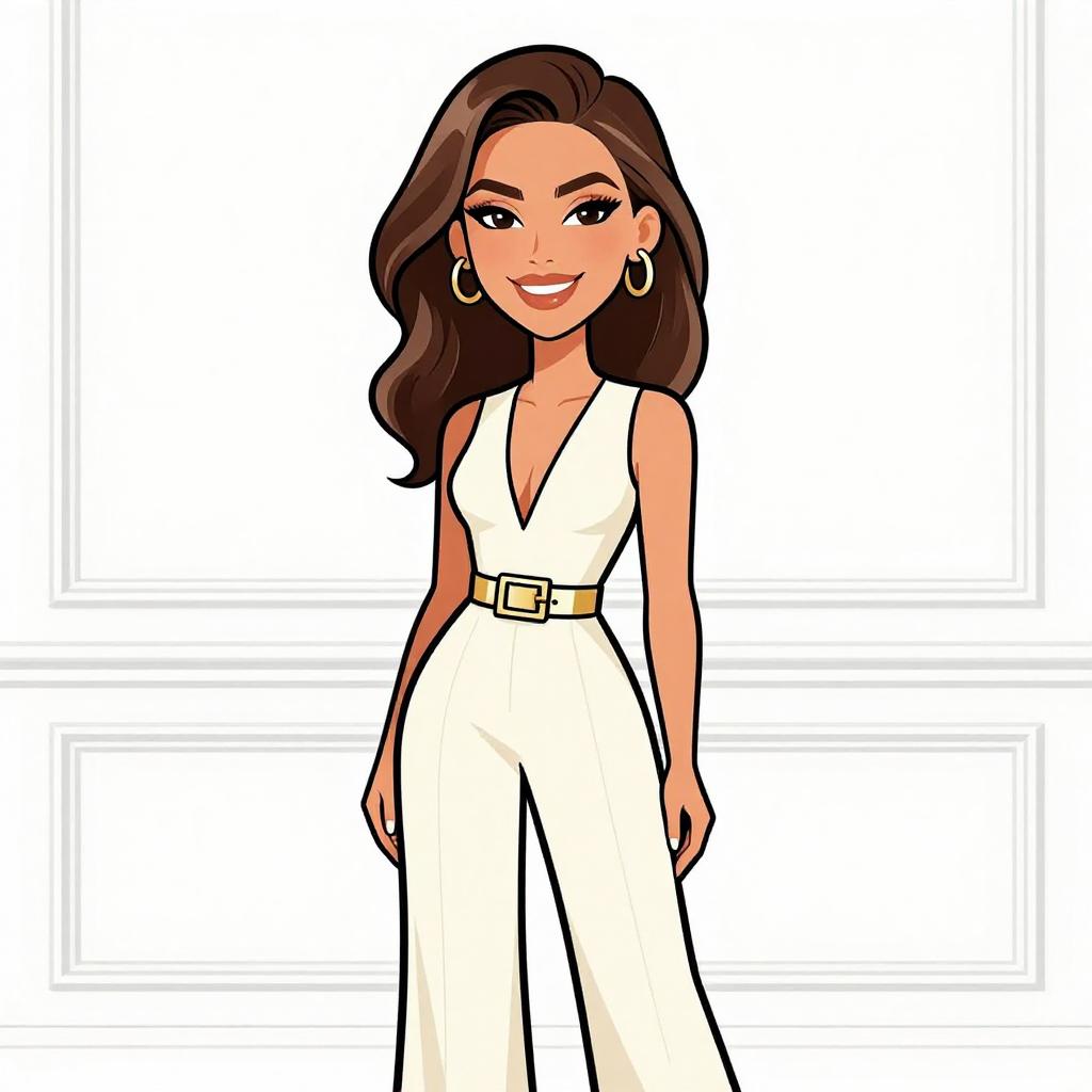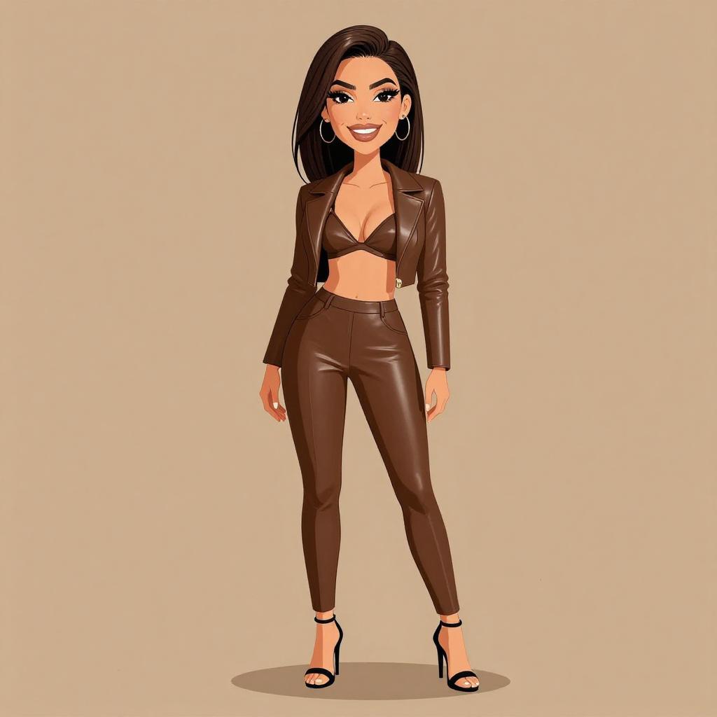 Woman with pretty face and pretty hair. smiling Woman, modern chic, sheer white patterned bodysuit with short sleeves, deep V-neck, beige high-waisted faux leather pants, tailored fit, zipper detail at the ankle, nude pointed-toe high heels, small beige handbag with handle, white background. --sref 1467