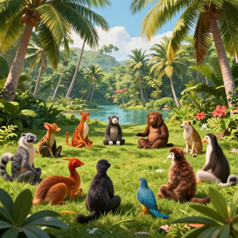Harmony and unity unfold in a vibrant tropical paradise, where diverse creatures gather in peaceful coexistence, embodying the timeless spirit of collaboration and the enduring promise of new beginnings.