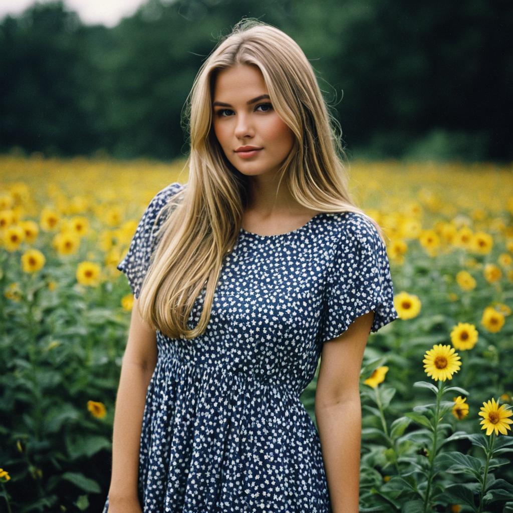Summer garb ,1girl, solo, dress, long hair, realistic, flower, looking at viewer, outdoors, blonde hair, brown hair, blurry, blurry background, short sleeves