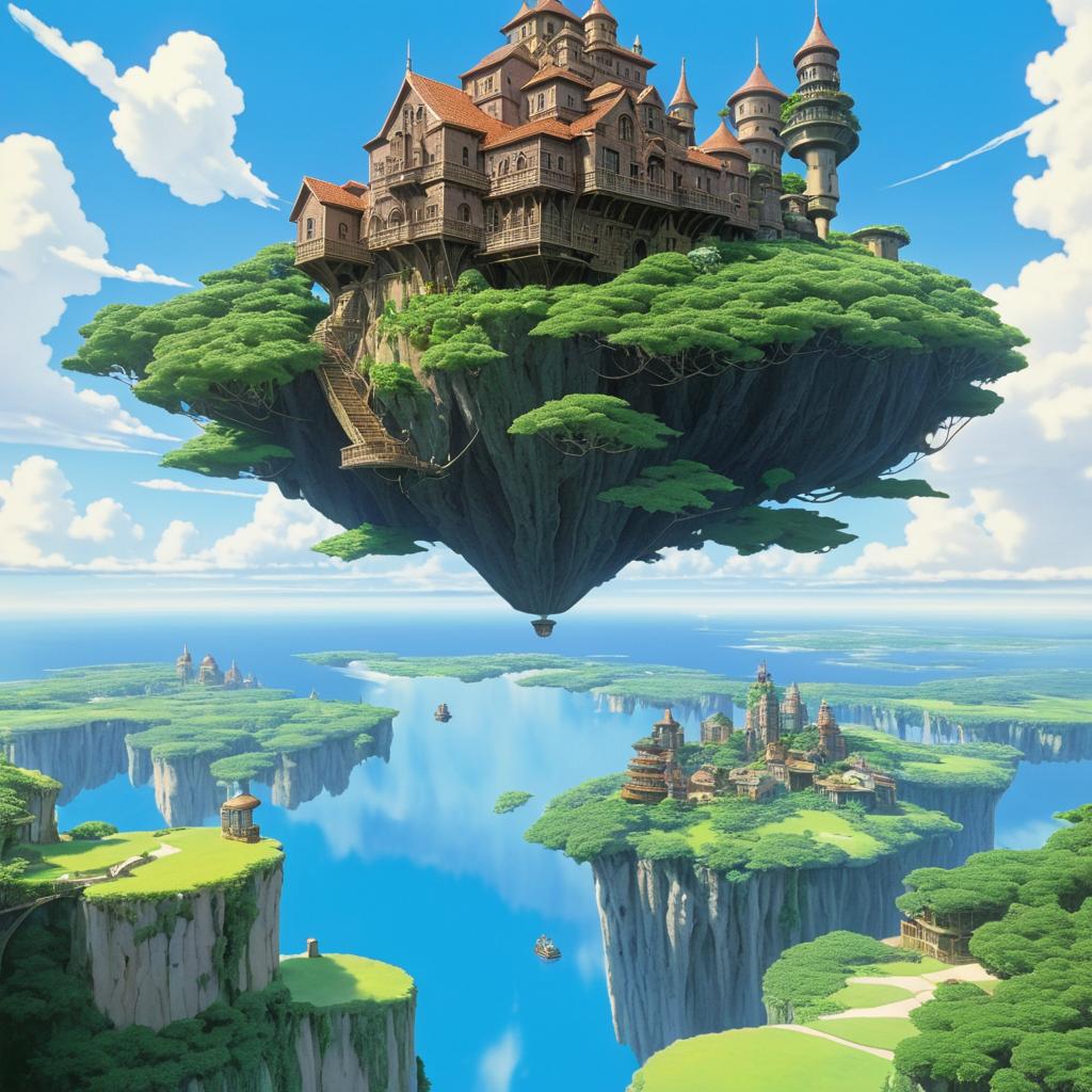 A hyper-detailed fantasy scene inspired by Studio Ghibli's Castle in the Sky featuring a floating island with a large lush tree, an old castle, and two characters standing on a wooden bridge. The island hovers above a blue sky and green landscape with additional floating structures visible in the distance.