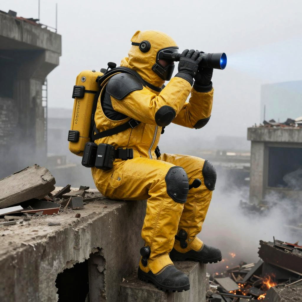Photograph of a person in yellow hazmat suit with gas mask, sitting on a concrete ruin, looking through binoculars in a smoky,