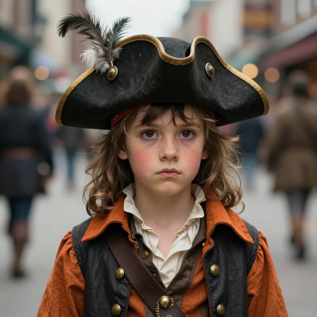 American revolution soldier, photograph of a young boy, portrait, realistic style, wearing a historical pirate costume, large black tricorne hat with gold trim, red coat with white lace collar and cuffs, dark blue necktie, brown leather strap across chest, blue eyes, fair skin, short brown hair, neutral expression, soft background, slight lighting shadow, high detail, realistic ures, child, innocent, historical attire, period clothing, T2I generated image, realistic lighting, studio setting