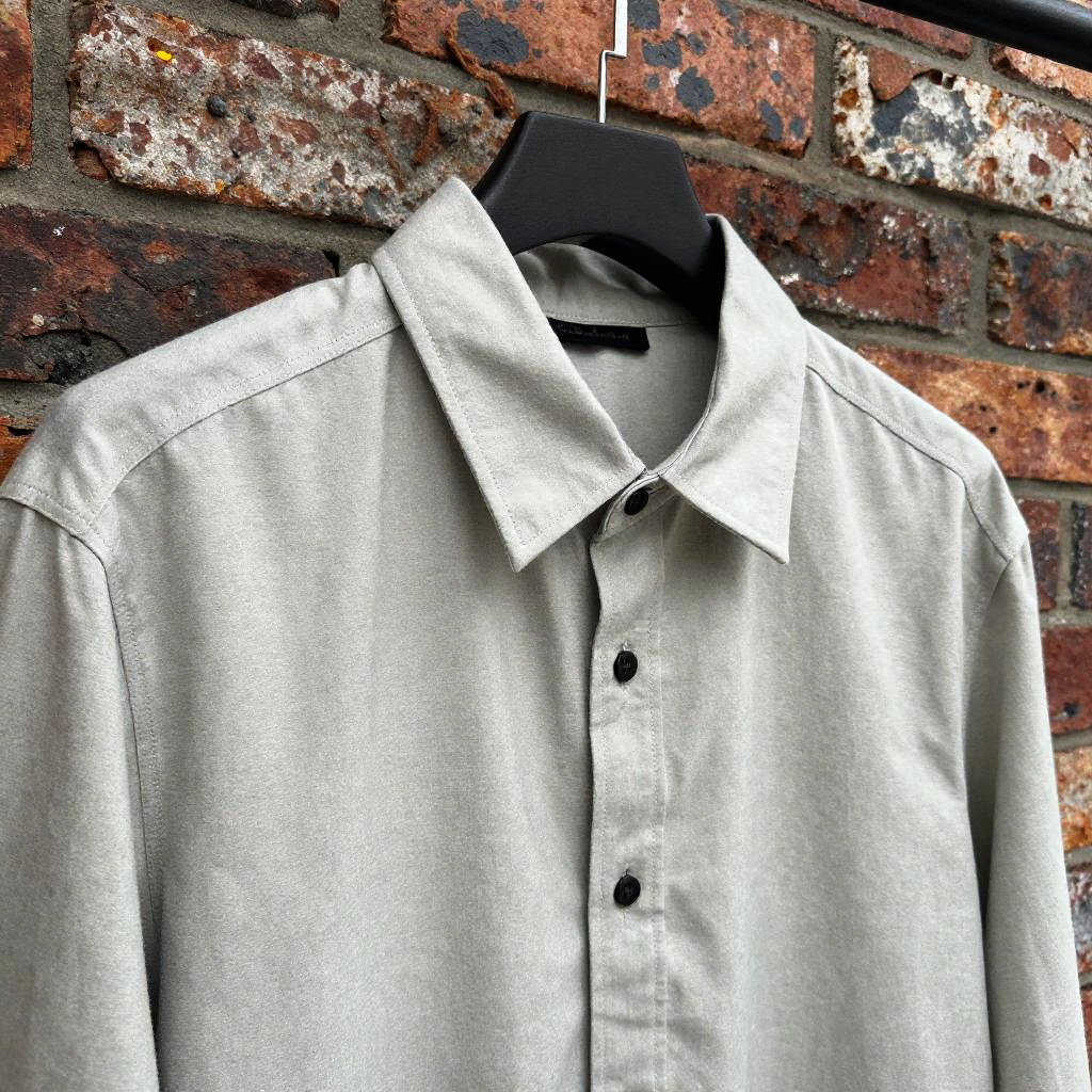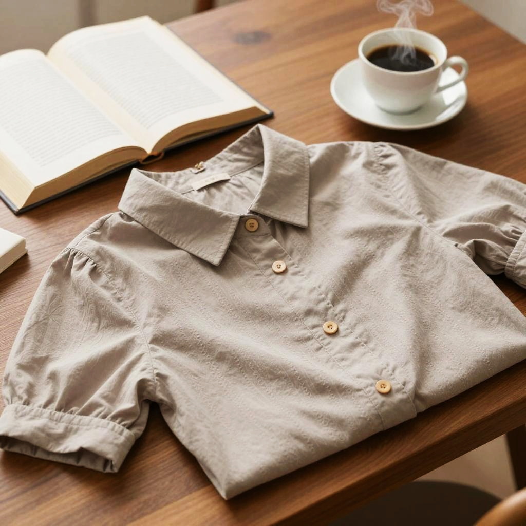 Unbutton blouse casually hanging on an elegant hanger against an aged brick wall, combining urban industrial vibes with a touch of casual sophistication, detailed close-up of buttons and fabric texture in natural lighting.