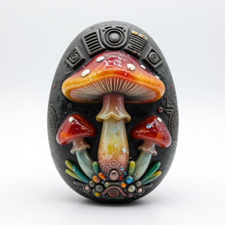 Aztec Carving peter maxx design vibrant mushrooms and translucent vivid color rock points - Remix by,