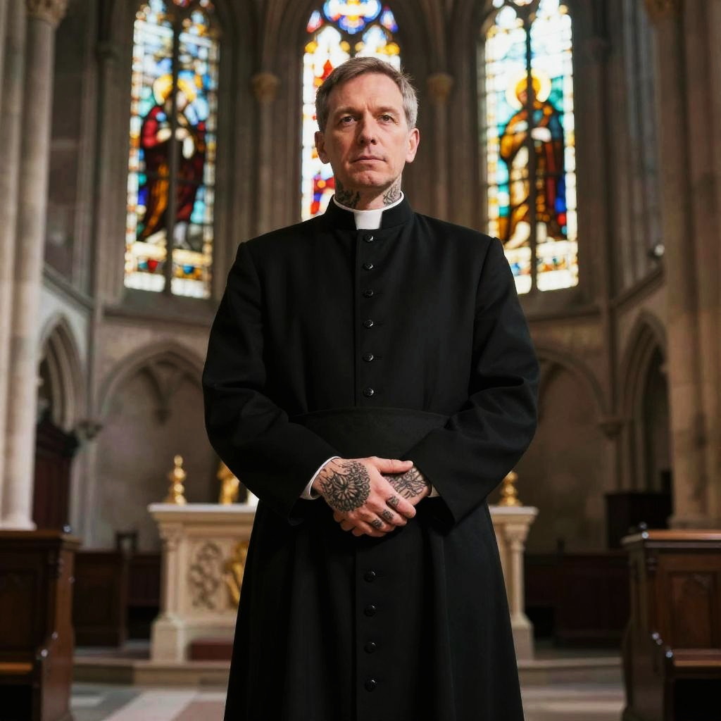 Catholic priest with tattoos standing in an ancient cathedral, wearing traditional black cassock, detailed ink designs visible on forearms, soft light filters through stained glass windows
