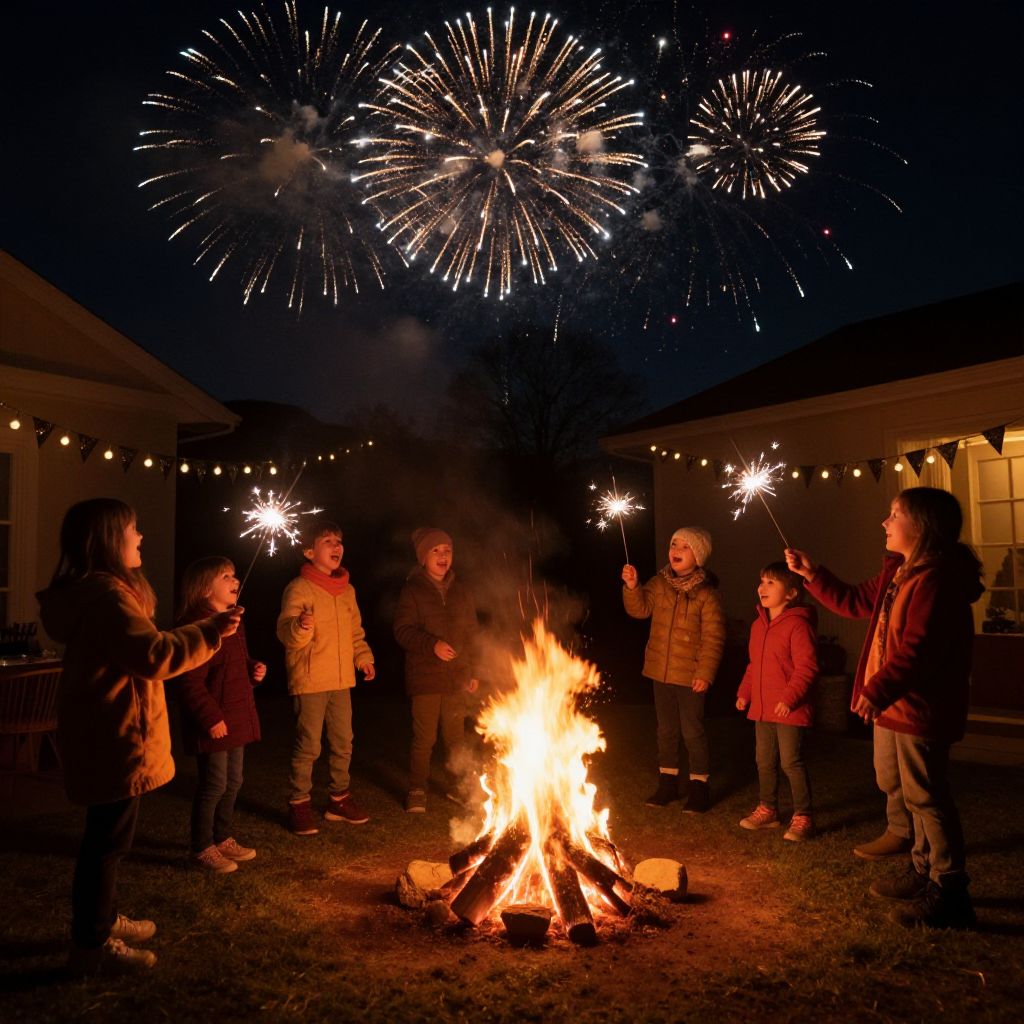 Photograph of a nighttime outdoor celebration featuring a large bonfire at the center. Dozens of people, mostly women in colorful, knee-length, vintage-style dresses with puffed sleeves and men in dark suits, dance around the fire. The sky is illuminated with bright, multicolored fireworks. Buildings with string lights and a wooden fence frame the background. The ground is dirt, and the scene has a warm, festive glow from the fire and lights. Trees and a dark blue night sky complete the picturesque setting.