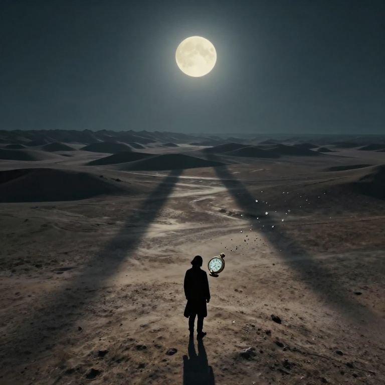 A dreamlike landscape evokes surrealism, featuring a colossal tower with melted facade emerging from an arid desert mirage, its pendulum extending endlessly into the cosmos. The golden sun casts elongated shadows across undulating sand dunes as a solitary wanderer, draped in a flowing, tattered robe, stands atop the highest dune, gazing at the celestial phenomenon. As twilight descends, an eerie glow envelops the scene, highlighting the intricate gears and cogs of the clock against the darkening sky. This image masterfully blends elements of dreamlike fantasy with the stark reality of the desert, instilling a sense of timelessness and introspection in viewers as they contemplate existence within this captivating dreamscape.