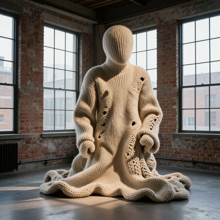 Artistic photography of a sculptural textile installation featuring a chunky, exaggerated knit silhouette in a loft-style industrial space with exposed brick walls and tall windows. The textured knit sculpture casts long shadows and has a rugged, organic look with visible knitting holes and yarn loops, positioned centrally to emphasize its form. The lighting is dramatic with a side spotlight highlighting the surface texture and volume.